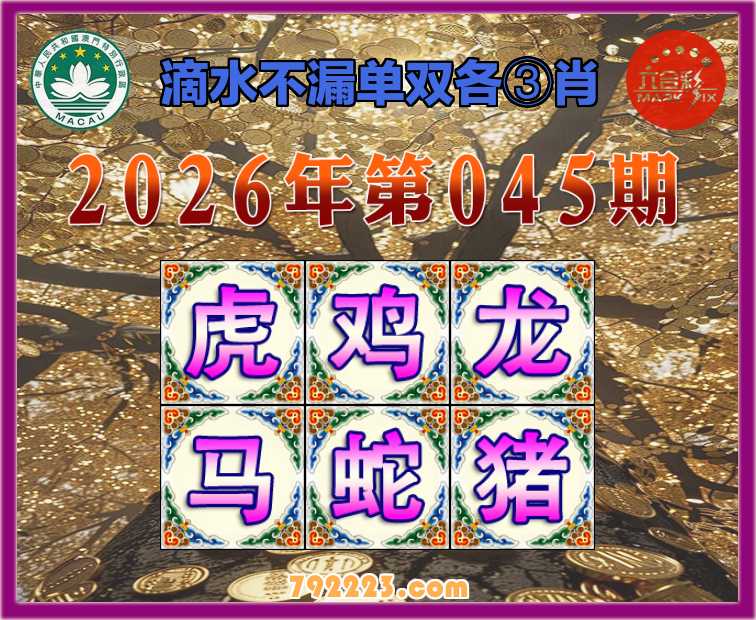 045期: 滴水不漏 🧩单双各③肖🧩【虎.鸡.龙.马..猪】开:蛇01