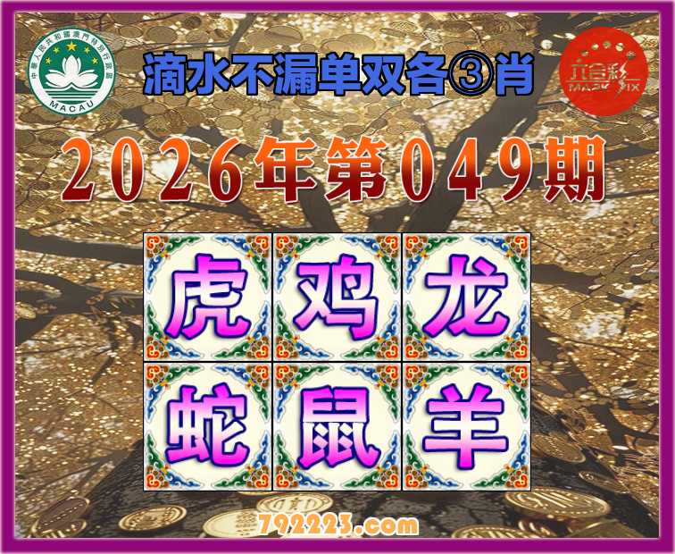 049期: 滴水不漏 🧩单双各③肖🧩【虎.鸡.龙.蛇.鼠.羊】开:马13