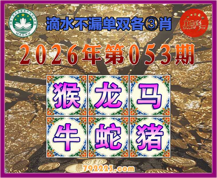 053期: 滴水不漏 🧩单双各③肖🧩【猴..马.牛.蛇.猪】开:龙15