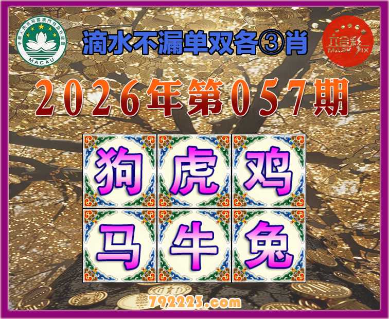 057期: 滴水不漏 🧩单双各③肖🧩【狗.虎.鸡.马.牛.兔】开:猴23